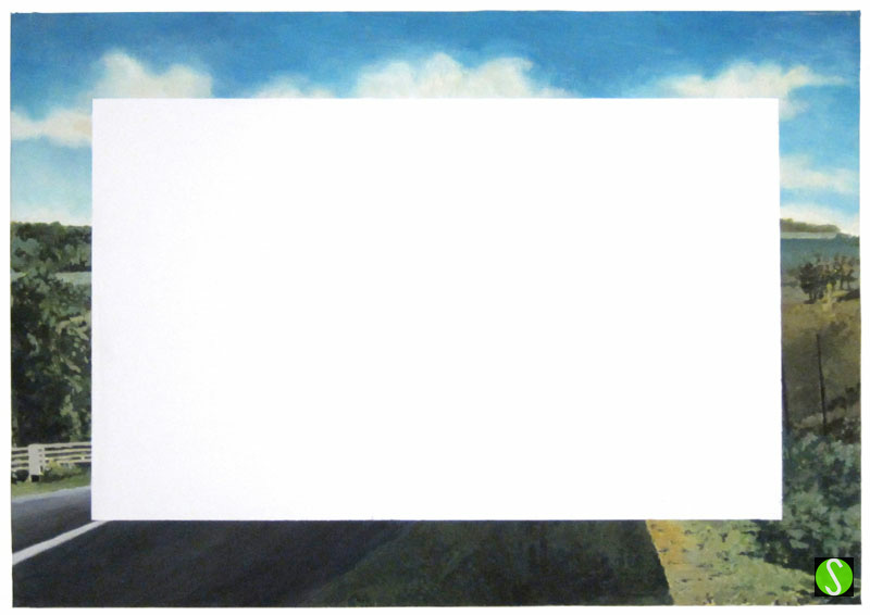 When looking at a painting, a viewer’s eyes naturally start in the center, but as there’s nothing present or depicted here, one’s eyes are drawn to the border where the partial image is of a road that leads you back in…to nothing.