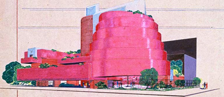 color reduction - it’s pretty surprising to read that Frank Lloyd Wright’s original proposal for the color of The Guggenheim was to be red. While appearing more like pink in his drawing, the intent was in his 1944 proposal to Hilla Rebay, art adviser to Solomon R. Guggenheim was ’Exterior: red-marble and long-slim pottery red bricks - red is the color of creation.’