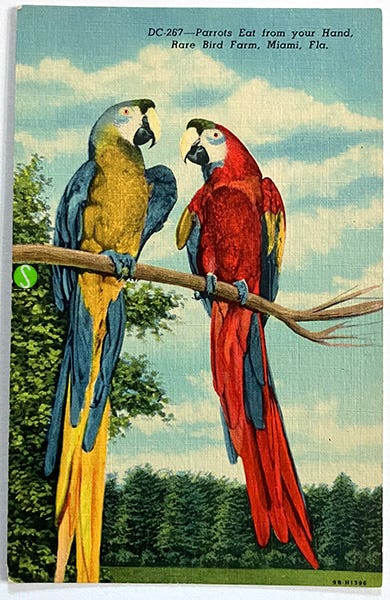 Come again? no really, it’s an optical illusion……. mondo bizzarro! A red bird is colored with a pigment, often a consequence of stuff it has eaten (flamingo - shrimp - pink). However when we see a bird that appears blue, the color we see is not due to a pigment but to the physical structure of the feathers themselves. If you grind up a ‘blue’ feather from one of these parrots, the dust would be gray.